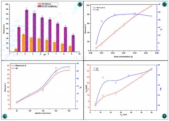 (A) The effect of solution pH on As(V) adsorption by BT-An@Zetag composites (Concentration: 50 mg/L, adsorbent weight: 20 mg, contact time: 120 min, and agitation speed: 200 rpm at 25 °C), and effect of (B) adsorbent doze, (C) agitation speed, and (D) initial concentration on As(V) adsorption by the BT-An@Zetag composite.