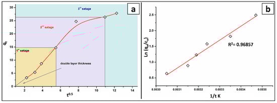The intraparticle diffusion was employed to investigate the adsorption process of As(V). The many stages of the intraparticle-diffusion model for As adsorption are clearly depicted in Figure 6a. Additionally, the adsorption achievement was not constant over the entire time range, indicating that the adsorption process is governed by several phenomena. The multilinear plot did not pass through the origin, implying that As(V) adsorption’s process is complex, with both intra-particle diffusion (i.e., boundary-layer diffusion) and surface adsorption contributing to the rate limiting step.