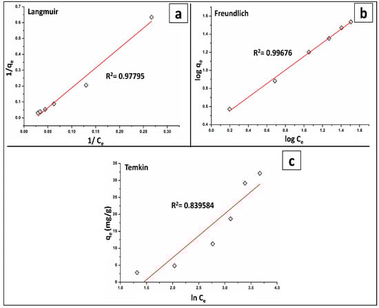 Isothermal models were used to examine the adsorption isotherm to demonstrate the interaction between As(V) and the fabricated BT-An@Zetag composite [40]. To illustrate the adsorption equilibrium data, the Langmuir, Freundlich, and Temkin isotherm models, Equations (7)–(9), were fitted and studied.