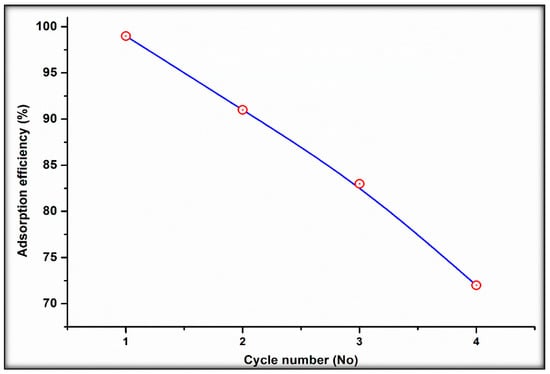 The ability of sorbent materials to be rejuvenated and reprocessed multiple times is a critical economic aspect because it determines the cost of production. The immediate attraction between the metal ions and the adsorbent surface was recovered by regenerating the arsenic-adsorbed composite in this study. After four consecutive cycles, the BT-An@Zetag composite adsorbent retained a high uptake affinity, as shown in Figure 8, with As(V) removal (percent) still above 70 percent. The results show that the synthesized composite is a good As(V) adsorbent that is also recyclable.