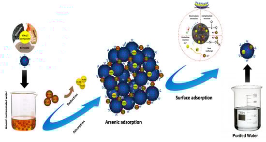 As a result of anthropogenic activities and natural processes, arsenic (As) has been discharged into surface water and groundwater, causing severe health concerns to humans and other living organisms. In many parts of the world, arsenic exposure has been associated with significant health risks such as kidney, bladder, lung, and skin cancers, as well as other skin diseases [1]. Toxic arsenic is consumed by 35–50 × 106 people in Bangladesh and West Bengal, more than ten million in Vietnam, and more than twenty million in China, according to current estimates [2,3]. Arsenic is often included in insecticides, glass, desiccants, alloys, pigments, electronic components, and pharmaceuticals, as well as wood preservatives in recent years, all contributing to arsenic poisoning [4,5]. Arsenic is mostly abundant in the aquatic environment as arsenate and arsenite species, with arsenate (As(V)) being the most prevalent in oxidizing conditions [6]. The presence of As(V) in natural water is a consequence of the leaching of arsenic-rich rocks and sediments [7,8]. Because arsenic is a known carcinogen as well as a toxic element, its presence in drinking water, even at trace levels, causes a health risk. The permitted limit of arsenic in potable water, according to the World Health Organization (WHO) and the United States Environmental Protection Agency, is 10 μg/L [9,10,11].