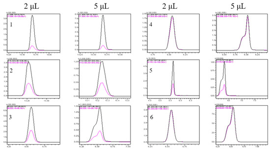 Chromatograms of six representative pesticides (Tebuconazole (1), Fipronil (2), Acetamiprid (3), Imidacloprid (4), 3-Indoleacetic Acid (5), Dimethoate (6); injection volume: 2 and 5 μL.