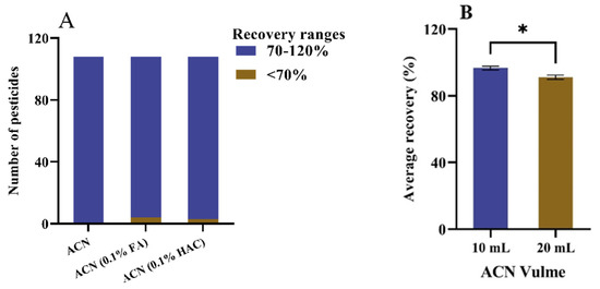 The results are shown in Figure 2. Under the condition of 0.1% FA acetonitrile, the recoveries of four pesticides were less than 70%, that is, indole propamocarb (67.60%), 6-furfuryl aminopurine (67.87%), brassinolide (58.41%), and carbosulfan (69.8%). Under the condition of 0.1% HAC acetonitrile, the recoveries of three pesticides were less than 70%: propamocarb (67.40%), 6-furfuryl aminopurine (65.64%), and brassinolide (57.34%). Under the condition of acetonitrile as the extraction solvent, all recoveries were 70% or higher, even though some pesticide recovery under acid conditions is better. However, in order to consider all pesticide recoveries, we finally chose acetonitrile as the extraction solvent. In the comparison of 10 and 20 mL of extraction solvent, it was found that the average recovery rate of 108 pesticides was 97.33% with RSD of 3.99 under the condition of 10 mL, and the average recovery rate of all pesticides was 94.72% with RSD of 3.40 under the condition of 20 mL of acetonitrile. We also performed a significance analysis, and the difference between 10 and 20 mL acetonitrile volumes showed a significant difference at the 0.05 significance level; thus, 10 mL acetonitrile was finally chosen as the best extraction condition.