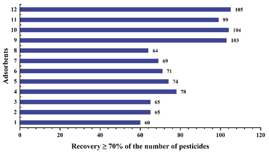 The number of pesticides with recovery ≥70% in methanol among adsorbent groups.