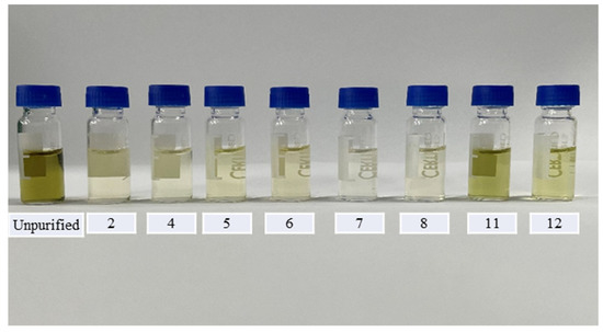 In the step of screening adsorbents, we referred to the method of Wang et al. [26]. We first conducted a series of simulated adsorption tests with solvent standard solutions to evaluate the adsorption behavior of various adsorbents on pesticides. The adsorbents in Table S2 were dispersed in 1.6 mL of a mixed standard solution containing all the target pesticides prepared in methanol at a concentration of 0.5 mg/L, and vortexed for 1 min to allow complete interaction between the target pesticides and the adsorbents. The supernatant was then centrifuged and separated, and the supernatant was passed through a 0.22 μm filter membrane for analysis to determine the amount of non-adsorbed pesticide. The adsorption capacity of the various adsorbents for the target pesticide was evaluated by comparing the mass ratio of non-adsorbed pesticide to the original added pesticide, with the results requiring ≥70%. This indicates that this adsorbent has a weak adsorption capacity for the target pesticide and can ensure satisfactory recovery during dispersive solid-phase extraction (d-SPE) decontamination of the matrix. We calculated the recovery of each target pesticide for all combinations of sorbents, and the results are shown in Figure 3. ZrO2 had the highest number of pesticides with ≥70% recovery at 105, followed by PSA and C18 at 104 and 103 respectively; the different multi-walled carbon nanotubes and their derivatizations showed stronger adsorption than the PSA and C18 combinations. We speculate that this may be a result of the preferential adsorption of pesticides by multi-walled carbon nanotubes in the absence of matrix interference, resulting in low recovery. Several representative groups of sorbents were selected for application to D. officinale base extracts to compare the purification effect, as D. officinale extracts were the darkest of the three substrates. From Figure 4, we observed that the cleanest purification was in group 7 (MWCNTs-NH2), and group 11 (PSA + C18) had the least satisfactory purification. Although ZrO2 has the best recovery, it was inferior to MWCNTs in terms of purification effect.