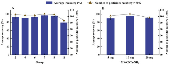 Finally, the dose of MWCNTs-NH2 was further optimized to compare the effect of the three doses on the recovery of the target pesticides (Figure 5B). As the dose increased, the purification effect was better, but 20 mg of MWCNTs-NH2 was also more potent for pesticide adsorption, with only 98 pesticides recovering more than 70%, at an average recovery rate of 90.86%. However, the average recovery rate for all pesticides at 5 mg was 89.56%. This was possibly due to the fact that low doses were not sufficient to purify the interfering components in 2 g samples, resulting in greater matrix interference and yielding an average recovery of MWCNTs-NH2 (95.52%) below 10 mg. Therefore, 10 mg of MWCNTs-NH2 was selected as the optimal dose of sorbent.