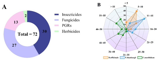 Traditional Chinese medicines (TCMs) have a long history, and because of their specific natural conditions and ecological environment, they are of better quality and efficacy than those produced in other regions [1,2]. Zhejiang is in a subtropical zone with a mild climate and abundant rainfall. There are many genuine medicinal materials in Zhejiang Province, among which the “Zhebawei” are the most famous; Fritillaria thunbergii Miq (F. thunbergii), Chrysanthemum Morifolium Ramat (C. morifolium), and Dendrobium officinale Kimura et Migo (D. officinale) all belong to “Zhebawei” [3]. F. thunbergii has the effect of clearing heat, and is an expectorant and antitussive [4,5]; C. morifolium has anti-inflammatory and antioxidant analgesic functions [6]; and D. officinale has antihyperlipidemia, antihypertensive, and antihyperuricemia properties [7]. The edible parts of these three herbs are bulbs, flowers, and stems. Due to the unique geographical environment of Zhejiang Province and the needs of the growth environment of TCMs, diseases and pests (such as root rot, gray mold, powdery mildew, aphid, and red spider) in the planting process of TCMs are prone and diverse. Chemical pesticides such as insecticides and fungicides are often used for disease and pest control, and plant growth regulators (PGRs) are also used to improve product quality and nutrition. The unregulated use of these chemical pesticides will not only result in excessive pesticide residues in TCMs, but will also have a serious impact on the efficacy of Chinese medicine and result in problems regarding factors such as food safety.