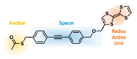 To date, only a few examples of electrochemical studies of AuNPs decorated with TTF units have been described in the literature. However, AC voltammetry has not been employed so far. Fujihara and colleagues created a stable gold electrode modified with AuNPs covered or interlinked by TTF thiols or tetrathiols []. Guo et al. studied using cyclic voltammetry AuNP systems with the TTF derivatives being directly linked to the gold surface through the sulfide bond, omitting any spacers [,]. The electrochemical behavior of TTF on other NP materials, such as PdNP [] or PbS NP [], was also studied.