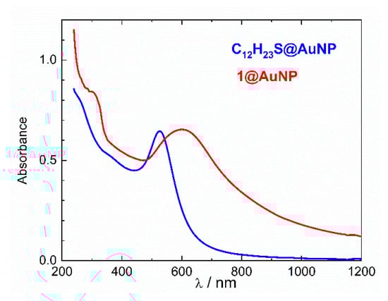 The position of the characteristic SPB for AuNPs is very sensitive to the character of the ligand attached to its surface. Due to the donor–acceptor interaction between the π-aromatic system of the electron-donating ligand 1 and the surface gold atoms of the AuNPs, a bathochromic shift of the plasmonic band was induced in 1@AuNPs compared to the C12H23S@AuNPs. Depending on the solvent, the difference was 73 to 103 nm. Figure 3 shows the comparison of the UV-Vis spectra of C12H23S@AuNPs (SPB at 527 nm) and 1@AuNPs (SPB at 600 nm) in chloroform. A broader SPB together with higher absorption in the high-wavelength region (~800 nm) indicate increased light scattering caused by partial aggregation of the surface-modified AuNPs.