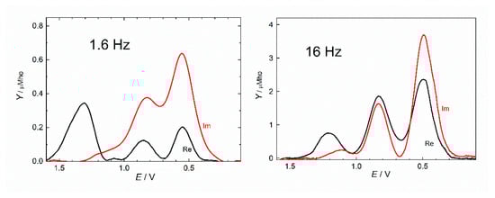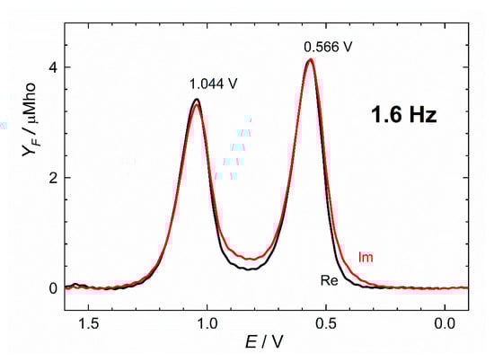 The application of the phase-sensitive AC voltammetry operating at low frequencies in the range 1.6 Hz to 16 Hz turned out to be the method of choice for our system. The amplitude of the superimposed AC signal was 10 mV (p-p). Such low frequencies used here are rather exceptional for this method. They help to minimize the imaginary admittance component of the blank, which is proportional to the frequency. The real and imaginary faradaic components superimposed over the blank decrease with the square root of the frequency; hence, the low frequency was used. These phase properties of the electrode admittance make it possible to find an optimum for the faradaic and background separation. Here, we report faradaic components already separated from the charging vectors.