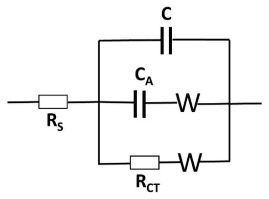 Equivalent electric circuit for the electrode impedance in case of adsorption of reactant. RS is the solution resistance, C is the double-layer capacity, CA is the adsorption “pseudocapacity”, and RCT is the charge transfer related to Equation (1). Ws are Warburg impedances representing the influence of diffusion. The working electrode is on the right lead of the circuit and the counter electrode on the left side.