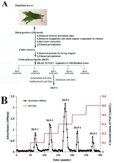 The fresh dandelion leaves were washed and dried at 50 °C for 48 h. Then, the dried dandelion leaves were crushed into powders and selected with a 100-mesh sieve. The powders were treated with petroleum to remove fat and extracted with 85% ethanol for 24 h to remove pigments and small organic compounds. After suction filtration, the filter residue was dried and extracted with distilled water (1:20, g/mL) at 80 °C for 2 h. After centrifuging (4000 rpm, 15 min) the extraction solution, the supernatant was concentrated to a proper volume by decompression at 70 °C in a rotary evaporator, and then precipitated with ethanol (1:4, v/v) for 12 h, and centrifuged again (4000 rpm, 10 min). Then, the resulting supernatant was deproteinized with the Sevag reagent and precipitated again with ethanol, collected by centrifugation (4000 rpm, 10 min). The precipitates were dialyzed against water for 48 h and lyophilized as crude DLPs.