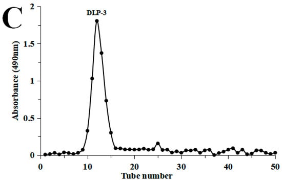 (A) Flow chart of extraction and purification of DLP-3; (B) chromatography of DLP-3 using a DEAE-52 cellulose column; (C) Sephadex G-100 chromatography.