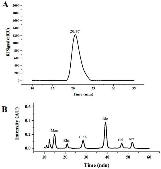 (A) HPGPC chromatograms of DLP-3; (B) monosaccharide composition of DLP-3.