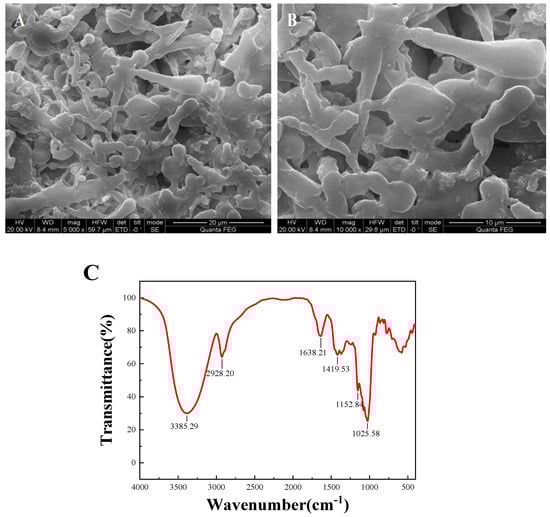 The microstructure of DLP-3 was determined using SEM at magnifications of 5000× and 10,000×, which are shown in Figure 3A,B. DLP-3 exhibited a smooth surface and a purely flake-like structure. The apparent structure of polysaccharides can determine their physical and chemical properties []. The smooth flake-like structure of DLP-3 may be related to its antioxidant, antibacterial, and anticancer activities.
