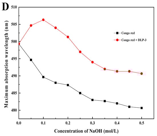 As shown in Figure 3D, the λmax of DLP-3 increases first, then decreases with an increasing concentration of NaOH, which indicates that DLP-3 has a triple helix conformation. Polysaccharides with triple helix conformation have shown higher biological activity than those without this conformation [,]. In this study, the triple helix structure of DLP-3 may be related to its strong biological activities.