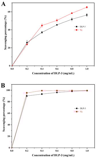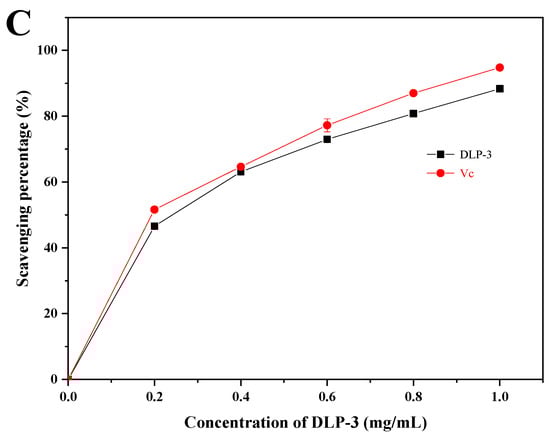 As shown in Figure 4C, DLP-3 exhibited strong scavenging activity that increased with an increase in concentration. The scavenging activity of DLP-3 was as high as 88.35% at 1.0 mg/mL.