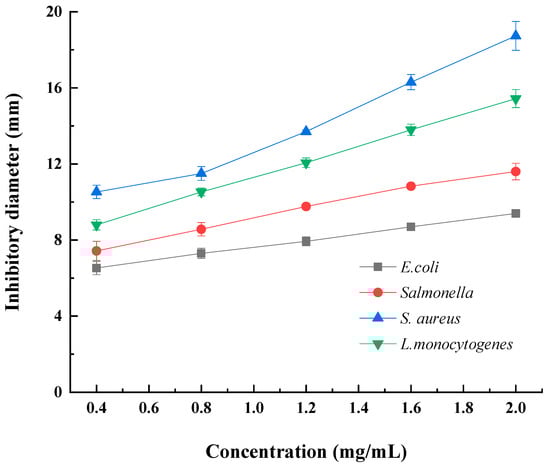 The antibacterial activity of DLP-3 was evaluated against two Gram-negative and two Gram-positive bacteria. As shown in Figure 5, DLP-3 showed a certain inhibitory effect on all strains, and the antibacterial activity increased with an increase in concentration (0.4–2.0 mg/mL). At the DLP-3 concentration of 2.0 mg/mL, the inhibitory diameters against E. coli, Salmonella, S. aureus, and L.monocytogenes were 9.4 ± 0.2 mm, 11.6 ± 0.6 mm, 11.8 ± 0.7 mm, and 15.4 ± 0.5 mm, respectively. As compared with previous reports, the antibacterial activity of LDP-3 against S. aureus was significantly stronger than that of the polysaccharides extracted from olive leaves (OLP) [] and the inhibitory activity of LDP-3 against S. aureus and L.monocytogenes was stronger than that of the polysaccharides isolated from Periploca laevigata root Barks (PLP1) []. However, DLP-3 showed lower inhibitory activity against E. coli than polysaccharides from spent mushroom substrates (PL2) [] and PLP1 []. The data showed that S.aureus and L. monocytogenes, two Gram-postive bacteria, were the most sensitive to DLP-3. The results of this study are consistent with those of Hashemifesharaki et al. (2020) [] who reported that marshmallow root polysaccharide showed stronger inhibitory effect on Gram-positive bacteria. Polysaccharides may destroy the inner membrane of cells, increase the permeability of cell membrane, and release electrolytes, resulting in bacterial cell death [,]. The inhibitory effects of DLP-3 on Gram-positive bacteria (S.aureus and L.monocytogenes) were significantly stronger than those on Gram-negative bacteria (E. coli and salmonella). This result may be due to the presence of lipopolysaccharide in the cell membrane structure of Gram-negative bacteria, which is more complete than Gram-positive bacteria [].