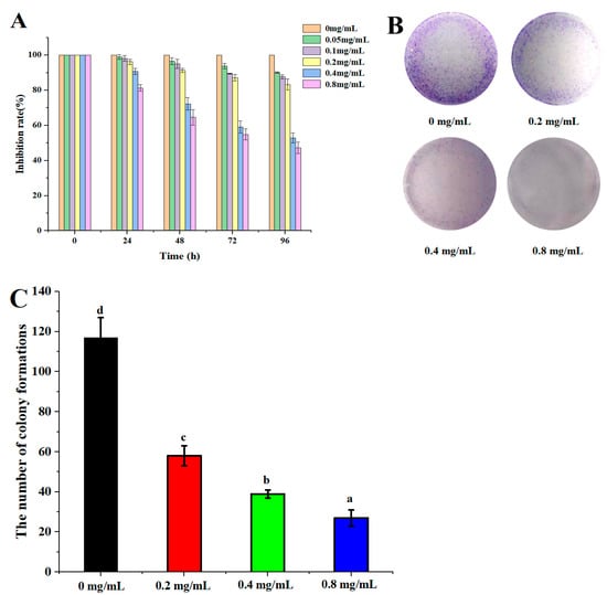 DLP-3 inhibits HepG2 cells proliferation in vitro. HepG2 cells were treated with different concentrations (0, 0.2, 0.4, and 0.8 mg/L) of DLP-3 for 0, 24, 48, 72, and 96 h: (A) The effect of DLP-3 on cell proliferation was evaluated using an MTT assay; (B,C) the clonogenicity of the indicated cells were detected after treatment with different concentrations of DLP-3. Data are presented as the mean ± SD, n = 3. Different letters above the bars indicate significant difference.