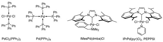 The optimal conditions for the palladium-catalyzed coupling were determined through a series of experiments in which different combinations of catalyst (Figure 1) and solvent were applied. Two groups of palladium catalysts were employed, differing by the Pd oxidation state—Pd(0) and Pd(II), and by the coordinated ligand—phosphine and NHC-type.