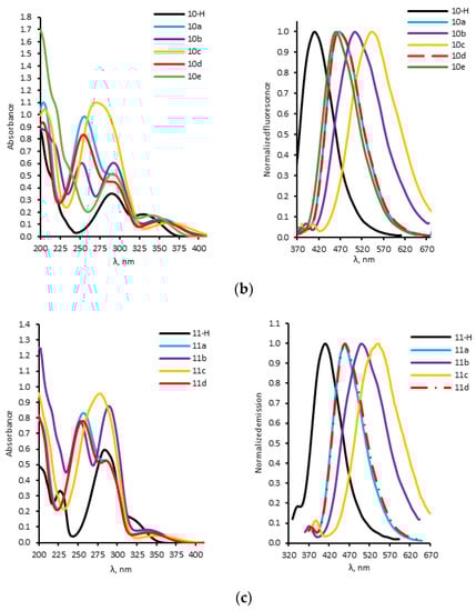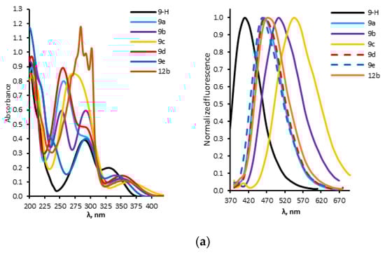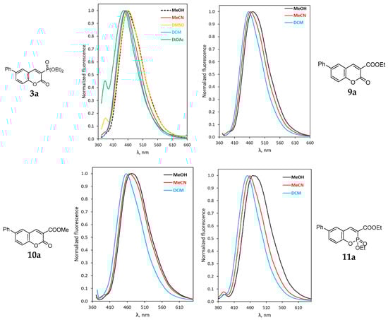 The spectral data of the other three coumarins bearing phenyl substituents—9a, 10a and 11a dissolved in acetonitrile, methanol and dichloromethane demonstrated minor solvatochromic effect from 13 to 16 nm—in MeOH the bands were red-shifted, while in DCM they were blue-shifted, and the maximum in acetonitrile was always between these two maxima (Table 7, Figure 3). Due to the higher solubility of the coumarins in acetonitrile compared to methanol, MeCN was selected as a solvent for all other synthesized derivatives.