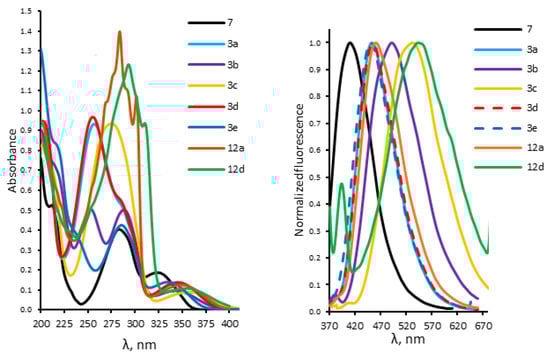 The derivative 12a with triple bond and without OMe group in para position exhibits a maximum at a shorter wavelength 461 nm. The largest bathochromic shift in the absorption and emission spectra was observed for the coumarin derivates with longer conjugated π-system, compounds 3c and 12d. They exhibited the same absorption maximum at 356 nm, which by 13 nm red-shifted compared to the corresponding spectra of the phenyl derivate, 3a, while their emission is shifted to the longest wavelength by 82 and 90 nm for 3c and 12d, respectively.