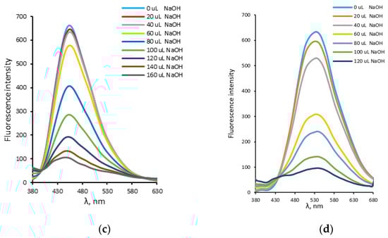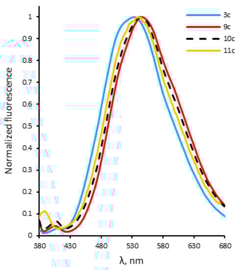 The same trend was observed for the ethyl and methyl coumarin-3-carboxylates and benzoxaphosphorines—the absorption and emission bands’ shift was highest when there is para-methoxyphenyl substituent (Figure 5) as the fluorescence is very similar to that of the corresponding phosphonocoumarins 3c and 12d—546, 543, and 541 nm for 9c, 10c, and 11c, respectively, Figure 6. Thus, the substituent in position C-3 does not affect the fluorescence of the coumarin species. The λmax in the fluorescence spectra of phenyl derivates is red-shifted by nearly 50 nm with respect to the unsubstituted coumarins, which for each series are denoted with the number of the parent series followed by H (Table 7).