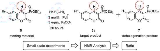 During the preliminary studies, some unexpected problems were faced due to the similar chromatographical behavior of compound 5 and the desired product 3a. This complicated the TLC monitoring of the reaction and the purification of diethyl 6-phenylcoumarin-3-phosphonate 3a. Formation of the dehalogenated coumarin structure 7 was also observed as a side product. Therefore, better reaction conditions needed to be developed for full conversion of 3b where no side reaction could be observed.