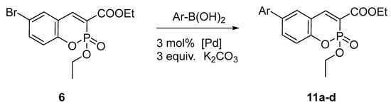 Under the optimized reaction conditions—PEPPSI-type catalyst, solvent mixture of toluene:water, potassium carbonate and in the presence of the selected boronic acid—the cross-coupling reaction with ethyl 6-bromo-2-ethoxybenzo[e][,]oxaphosphorine-3-carboxylate 6 was achieved, Scheme 7, Table 5. The yields for the arylated products 11a–d are similar to the ones obtained for the corresponding chemoisomeric structures 3a–d. However, the time needed for the consumption of the starting material compared with the 3-phosphonocoumarin derivatives was shorter.