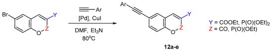 Most reactions with the chosen substrates were performed under classical conditions for Sonogashira coupling [,]—Pd(PPh3)2Cl2/CuI as a catalytic system in the presence of Et3N in DMF at 80 °C under argon atmosphere. To compensate the electron-rich nature of the 4-ethynylanisole, entry 4, Table 6, PEPPSI-type complex was applied. However, these conditions resulted in the formation of product 12d in only a 56% yield. Reaction of the same alkynylating reagent and ethyl coumarin-3-carboxylate 8a was not carried out since the product is a known compound and was prepared under the same classical conditions []. The Sonogashira reaction in analogues conditions involving the methyl carboxylate 8b had also been reported [].