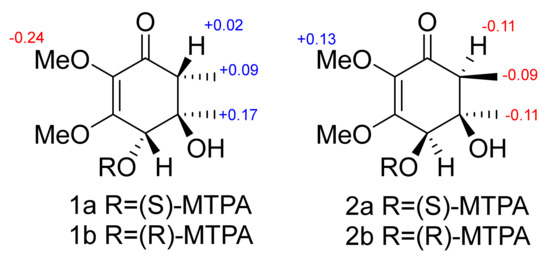 The relative configurations of 2 were assigned based on the ROESY correlations (Figure 3 and Figure S17 from Supplementary Materials) between H-4 (δH 4.25), H-6 (δH 2.32), and H3-7 (δH 1.19). The absolute configuration of 2 was established by the modified Mosher’s method [18]. The esterification of 2 with (S)- and (R)-MTPA chloride occurred at the C-4 hydroxy group to yield the (R)-and (S)-MTPA esters 2a and 2b, respectively. The observed chemical shift differences Δδ(δS-δR) (Figure 4) indicated the 4R configuration, and therefore, the absolute configurations of 2 were established as 4R,5R,6S. Compound 2 was named lopouzanone B.