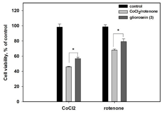 The cytoprotective activity of gliorosein (3) at 10 µM against CoCl2-mimic hypoxia and rotenone toxicity in H9c2 cells. The data are presented as a mean ± standard error of mean (SEM). * The differences are significant with p ≤ 0.05.