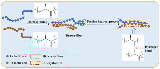 Figure 2 shows a schematic diagram of the stereo-complexation process for PLLA/PDLA fiber. Amorphous regions, HC crystallites, and SC crystallites coexisted in drawn−fiber (see Figure 1a). During the drawing process, HC crystallites and SC crystallites formed simultaneously. Due to the low drawing temperature (62 ± 2 °C), HC crystallites usually outnumber SC crystallites, even though SC is more thermodynamic favorable. This is because the enantiomers PLLA and PDLA must participate in a side-by-side manner in the stereo-complex process, and they will suffer from extended chain diffusion paths [7], resulting in a dominant ratio of HC crystallites in the crystalline region of drawn−fiber. Tension heat-setting treatment facilitated further crystallization of PLLA/PDLA fiber, leading to the formation of SC−PLA fiber with higher crystallinity. It has been found that temperature is essential and significant for an effective stereo-complexation process [15,33,34,35]. When the heat-setting temperature is lower than the melting point of HC, PLLA, and PDLA, segments do not have enough mobility to move to the vicinity of their enantiomers, so only a small amount of SC structures can be formed. When the heat-setting temperature is higher than the melting point of HC, in addition to SC spontaneous crystallization from the amorphous region, some of the HC were melted and rearranged to form new SC crystallites because the original SC crystallites acted as a template during the tension heat-setting process [35,36,37,38].