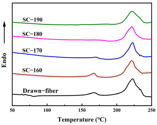 Figure 3 shows DSC heating curves of drawn−fiber, SC−160, SC−170, SC−180, and SC−190. Both drawn−fiber and SC−PLA fiber had an obvious melting endothermic peak near 222.5 °C, corresponding to the melting peak of SC crystallites. However, PLLA/PDLA drawn−fiber and SC−160 also had a weak melting endothermic peak of HC at about 168.0 °C, meaning that HC crystallites and SC crystallites coexisted in the fibers. As the tension heat-setting temperature increased, the melting peak of HC crystallites weakened. When the tension heat-setting temperature increased to 180 °C or 190 °C, the melting peak of HC crystallites disappeared and only a melting peak of SC crystallites existed in the DSC heating curve. A small melting peak of HC crystallites and a large melting peak of SC crystallites were observed in the DSC curve of drawn−fiber, which contradicts the WAXD profile, which lacks a SC crystalline peak (Figure 1a). This seeming contradiction can be explained by the melting of HC crystallites and transformation into SC crystallites during DSC heating [39]. In this study, PLA fiber with complete SC structure was obtained using a lower heat treatment temperature on a polyester fiber production line without additives compared with previous researches [40]. It provides a simpler route to produce PLA fiber with a high melting temperature.