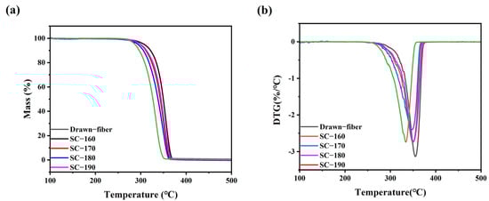 Figure 4 shows the thermal weight loss curves of the drawn−fiber and SC−PLA fiber. The temperature at 5% mass loss (T5%), the maximum decomposition temperature (Tmax), and the decomposition end temperature (Tend) of PLLA/PDLA fiber are listed in Table 3. As illustrated in Figure 4 and Table 3, as the tension heat-setting temperature increased, the thermal stability of PLLA/PDLA fiber showed a downward trend. SC−190 fiber had the worst thermal stability, although the DSC results demonstrated its SC crystallites’ ratio was as high as 100%, and T5% was lower than that of drawn−fiber by nearly 30 °C. This may be due to the occurrence of thermal degradation of PLA at high heat-setting temperatures, which caused the decrease in thermal stability of the fiber.