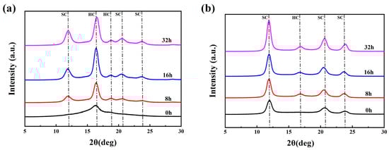 The hydrolysis resistance of PLLA/PDLA fiber was investigated by accelerated hydrolysis tests in a 95 °C water bath. Figure 6 shows the WAXD patterns of drawn−fiber and SC−190 fiber exposed to accelerated hydrolysis for different times. Table 5 lists the crystallization parameters of PLLA/PDLA fiber versus hydrolysis time. The drawn−fiber presented a clear WAXD pattern dominated by amorphous regions, and the characteristic diffraction of HC at 2θ ≈ 16.4° was observed. After accelerated hydrolysis, the diffraction peaks of SC crystallites appeared at 2θ ≈ 11.9°, 2θ ≈ 20.6°, 2θ ≈ 23.8°. With prolonged hydrolysis time, the diffraction peak intensity of both the SC crystallites and HC crystallites increased, while the crystallinity and the absolute content of SC crystallites for the drawn−fiber increased. This implies that the amorphous region, HC crystallites and SC crystallites of the drawn−fiber were hydrolyzed to different degrees. Furthermore, the amorphous region had the fastest hydrolysis rate, followed by HC, while the SC crystallites had the slowest hydrolysis rate due to their stronger intermolecular forces and more stable crystal structure [12,16,32,43]. Therefore, the amorphous region no longer dominated, and the diffraction peaks of SC crystallites increased significantly for the drawn−fiber after accelerated hydrolysis. As seen from the WAXD patterns of SC−190 samples during the accelerated hydrolysis, the characteristic diffraction for SC crystallites were predominantly observed, while a weak diffraction peak corresponding to HC appeared near 2θ ≈ 16.7° with the extension of the hydrolysis time. This may be ascribed to the crystallization of partially amorphous regions to form HC at 95 °C in the water bath. The changes of SC−190 in crystallization performance after hydrolysis was similar to that of drawn−fiber, and the crystallinity and absolute content of SC crystallites increased significantly.