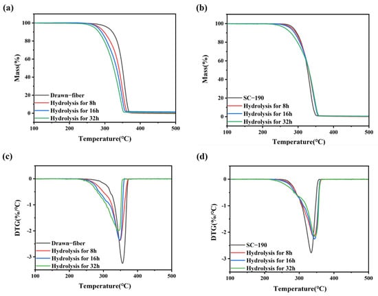 (a) TGA and (c) DTG curves of drawn−fiber and (b) TGA and (d) DTG curves of SC−190 fiber hydrolyzed for different times.