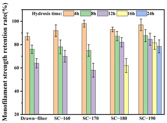 To confirm the effects of formation of SC crystallites on the hydrolysis resistance of fiber, the monofilament strength retention rate was determined, and the results are summarized in Figure 8. With the extension of hydrolysis time, the monofilament strength of drawn−fiber and SC−PLA fiber showed a decreasing trend. The monofilament strength retention rate of SC−190 fiber hydrolyzed for 24 h had the highest value of 78.5%. In contrast, the monofilament strength of drawn−fiber, SC−160, and SC−170 after 12 h hydrolysis dropped to an untestable level. It is suggested that the mechanical properties of SC−190 fiber were relatively stable, i.e., its hydrolysis resistance was better. This is ascribed to the high crystallinity and complete SC structure of SC−190 fiber as well as the strong intermolecular force in the SC crystallites. Therefore, water molecules could not easily diffuse into the crystal region where the segments are closely arranged, resulting in better hydrolysis resistance, which can expand the application prospect of PLA fiber.