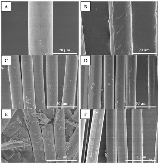 SEM micrographs of drawn−fiber hydrolyzed for different times ((A) 0 h, (C) 8 h, and (E) 32 h) and SC−190 hydrolyzed for different times ((B) 0 h, (D) 8 h, and (F) 32 h), (A,B) 2000×, (C–F) 1000×.