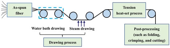 The post-spinning process of the PLLA/PDLA fiber is shown in Figure 10. The drawing process consisted of two steps: water bath drawing at 62 ± 2 °C and steam drawing. The total drawing ratio was up to 3 times. To obtain PLLA/PDLA fiber with different stereo-complex rate, a high-temperature tension heat-setting process at 160 °C, 170 °C, 180 °C, and 190 °C was adopted respectively.