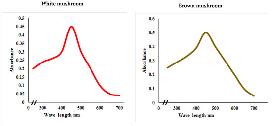 UV–visual spectra showing the absorbance peak of AgNPs prepared from white and brown mushroom.