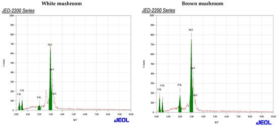 Energy-dispersive X-ray spectrum assay for AgNPs prepared from white and brown mushroom.