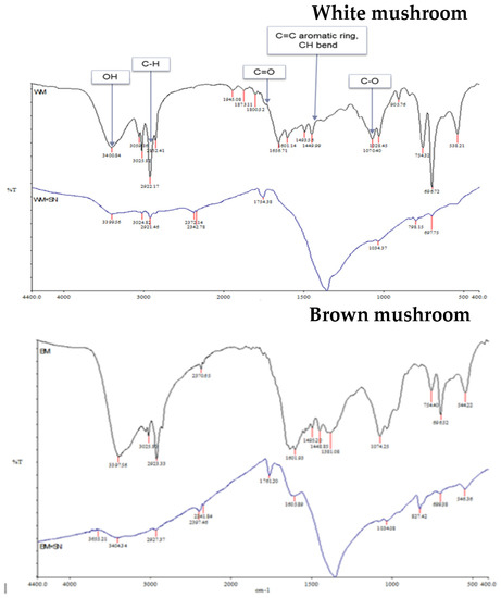 Mushrooms are rich in active compounds [30,31,32] which can assist the green synthesis of NPs and can act as a capping agent for less aggregation of synthesized nanoparticles [32]. FTIR spectroscopy was used to analyze these components in mushroom extracts (Figure 5). Although mushrooms are rich in bioactive compounds and nutrients, the contents of these bioactive compounds depend on the cultivar [43]. The recorded spectral of two different mushrooms shows some distinct spectral curves which indicate slightly different compositions in lipids (3000–2800 cm−1), proteins (1700–1500 cm−1), pectin (1790–1720 cm−1), cellulose and hemicellulose (1300–1180 cm−1) and other carbohydrates (fingerprint region 1200–900 cm−1) [44]. The biological method of synthesizing AgNPs is a three-step procedure. First is the activation phase where metal ions are reduced with the help of reducing agents present in the extract. The second is the growth phase where reduced metal ions form NPs. Finally capping is performed by metabolites present in the extract for stability [31]. The IR spectrum of the extract shows peaks corresponding to the OH stretching due to phenols, N-H and C-H bending corresponding to amide and aromatic groups, and peaks for C=C stretch. The IR spectrum of the synthesized nanoparticles shows a shift in the peaks and also the appearance of some new peaks. The presence of new peaks at 3399.56 cm−1; 2921.45 cm−1; 1754.38 cm−1; in white mushroom-AgNPs and at 3404.21 cm−1; 2141.54 cm−1; 1761.20 cm−1; 1605.39 cm−1; 1380.42 cm−1; 699.38 cm−1 in brown mushroom-AgNPs indicates some changes in the chemical composition and functional groups of proteins, lipids, and carbohydrates in the mushroom extract. The reduction and capping of synthesized AgNPs might be due to the presence of phenols, flavonoids, carboxylic, or amide groups which were seen in the IR spectrum.