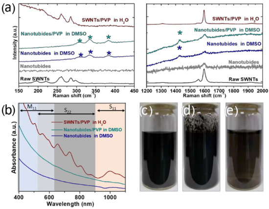 (a) Raman spectra of SWNTs at different stages, taken with a 633 nm laser excitation. The bands marked with * come from DMSO. From the bottom to the top are the raw SWNTs, nanotubides, nanotubides in DMSO, nanotubides/PVP in DMSO, and SWNTs/PVP in water. (b) UV–vis–NIR absorption spectra of SWNTs/PVP in H2O, nanotubides/PVP in DMSO, and nanotubides in DMSO. Photographs of nanotubide dispersion in DMSO before (c) and after (d) being exposed to air. (e) Photograph of neutralized nanotubide/PVP aqueous dispersion.