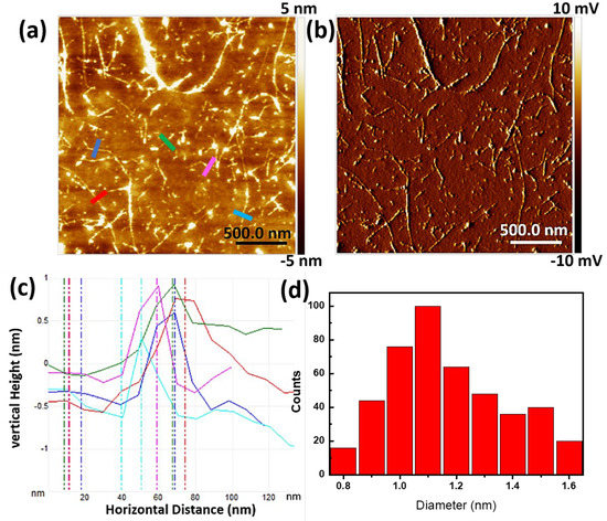 Atomic force microscopy characterizations were performed to further verify the dispersion of SWNTs cast onto a bare Si substrate (Figure 2a). The surfaces of dried SWNTs are not very smooth, suggesting the wrapping of SWNTs by PVP via a thermodynamic wrapping configuration [34]. Height analysis from the bare sections of SWNTs gives a diameter distribution ranging from 0.8 to 1.6 nm (Figure 2c,d), close to the diameters of starting HiPco SWNTs. The results also confirm that the dispersion mainly contains individual tubes or small bundles.