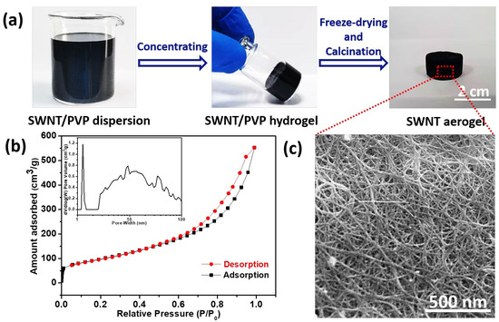 The abovementioned SWNT dispersion strategy is also applicable to Tuball SWNTs, which can be supplied in a large quantity. The illustration for the transformation from SWNT dispersion to aerogels is shown in Figure 3. The SWNT hydrogels were first prepared by the concentration of SWNT dispersion. After the subsequent freeze-drying and heat treatment, the SWNT aerogels are obtained. Figure 4a presents the optical photograph of prepared SWNT/PVP dispersion with an estimated SWNT concentration of 1.18 mg/mL. By controlling the water evaporation, the concentration of SWNTs was increased to 6 mg/mL. The concentrated SWNT suspension was opaque and very viscous, the standing of which for 12 h led to the formation of SWNT/PVP hydrogels (Figure 4a). This phenomenon can be explained by the topological entanglements of SWNTs which take place when the SWNT concentration is higher than a threshold value. After lyophilization, the hydrogels were transformed into aerogels without significant volume shrinkage, and the PVP molecules wrapped on SWNT surfaces could be decomposed by calcination in Ar. The density of SWNT aerogels is directly correlated with the concentration of SWNTs in SWNT/PVP hydrogels. As the dispersed SWNTs exhibit a high aspect ratio, gelation readily occurs at an SWNT threshold concentration of 6 mg/mL, resulting in SWNT aerogels with a similar density after lyophilization. The determined BET specific surface area is 357 m2/g with a pore volume of up to 0.67 cm3/g at P/P0 = 0.95 (Figure 4b), and the pore size distribution profile (Inset of Figure 4b) provides evidence of the existence of hierarchical pores in aerogels [35,36]. Scanning electron microscopy (SEM) (Figure 4c) and transmission electron microscopy (TEM) characterizations further confirm the assembly of SWNTs in porous aerogels (Supplementary Materials Figure S2).