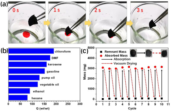- Bi, H.; Xie, X.; Yin, K.; Zhou, Y.; Wan, S.; He, L.; Xu, F.; Banhart, F.; Sun, L.; Ruoff, R.S. Spongy graphene as a highly efficient and recyclable sorbent for oils and organic solvents. Adv. Funct. Mater. 2012, 22, 4421–4425. [Google Scholar] [CrossRef]