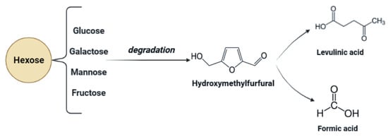 In the process of acid hydrolysis, temperatures above 110 °C cause the formation of toxic inhibitory compounds such as furfural and 5-hydroxymethyl furfural [79]. These compounds inhibit enzymatic and microbial hydrolysis. Their removal is necessary and possible adsorption on activated carbon or precipitation with calcium hydroxide. Other inhibitors such as chloric, phosphoric, or nitrous acids can be formed with increasing temperature and depend on the hydrolyzing agent and pollution of biomass with inorganic pollutants [13,86]. Acidic pretreatment generates inhibitors that must be removed to minimize downstream processing costs. In Figure 3, possible inhibitory compounds occurring due to cellulose monomers degradation are presented.