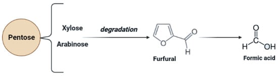 This process improves the digestibility of cellulose but the decomposition of sugars in this method is less than in acidic pretreatment. However, the main obstacle to this method is the high cost of alkalis. The application of calcium hydroxide, due to its low cost and ability to recover or regenerate ammonia, which is recyclable due to volatility, can be used as a solution to this problem [83,89]. Alkaline pre-treatment also enables hemicellulose degradation. In this case, pentoses may occur [79]. Due to secondary transformations during the hemicellulose structure degradation, secondary derivatives of pentoses may occur (Figure 4).