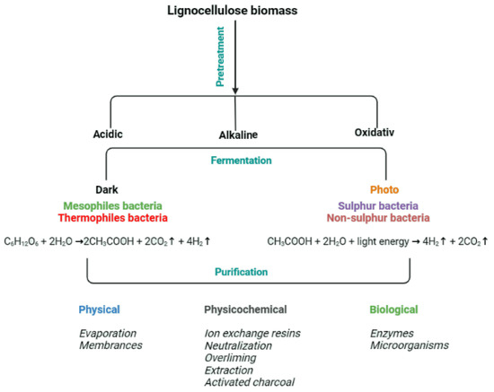 The object of interest for this review paper is hydrolysate generation for biohydrogen production via dark fermentation by microorganisms, especially bacteria and yeasts. There are two types of fermentation to produce biohydrogen by bacteria: one is photo fermentation, which requires a light source, and the other is dark fermentation, which does not require light. Many carbon sources are used in these reactions, all of which are supplied by biomass [14]. The matrix for biohydrogen generation is complexed and therefore, a large group of derivatives may be generated during the pre-treatment step. The effect of the derivatives on the fermentation efficiency must be taken into account [1,5,6]. The unfermentable compounds occurring in the pre-treated biomass hydrolysates must be also considered, as these substances may be further present in the post-fermentation broth and may interact as promoting or inhibiting agents [11,13].